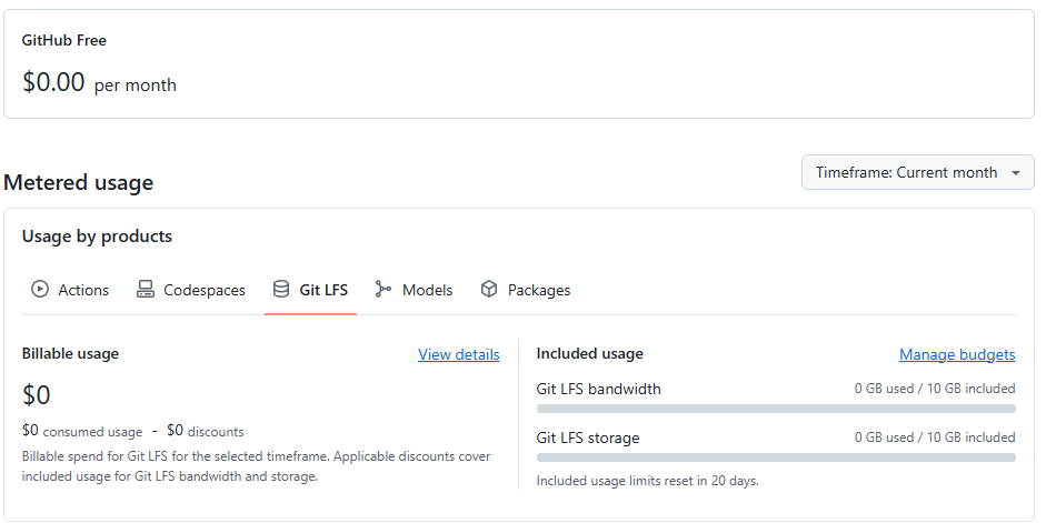 Github free for an organization has a 10GB bandwidth limit, 10GB storage limit for LFS, 15GB per developer for code space, and 2GB push limit. There’s some other stuff, but these were most important for me getting started.